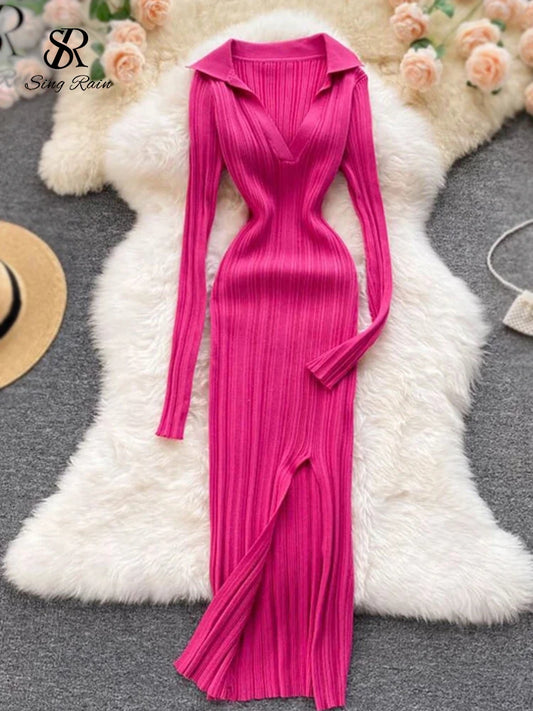 SINGREINY Women Korean Knitted Dress Long Sleeve V Neck Elastic Slim Pencil Dresses 2021 Autumn Sexy Bodycon Split Sweater Dress
