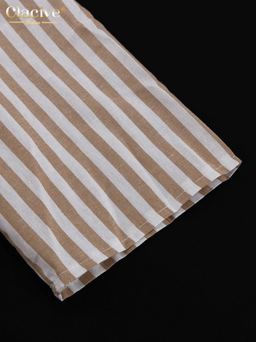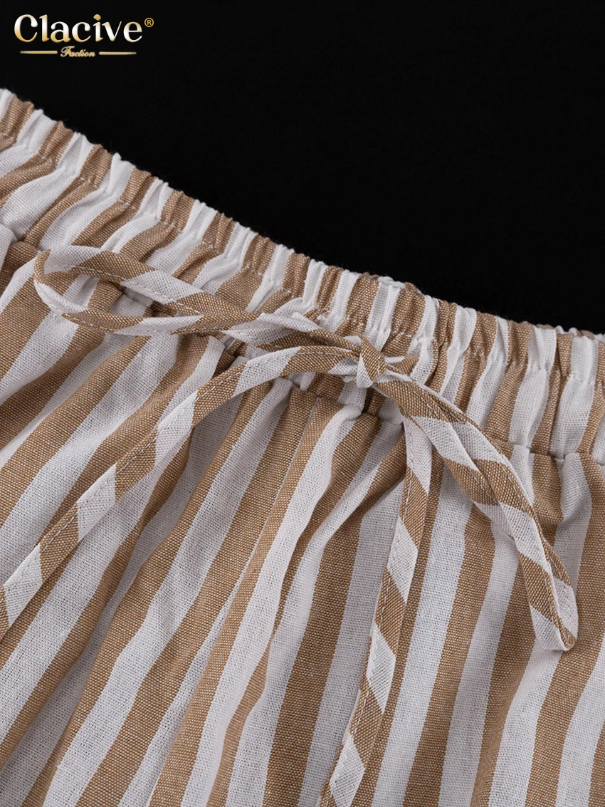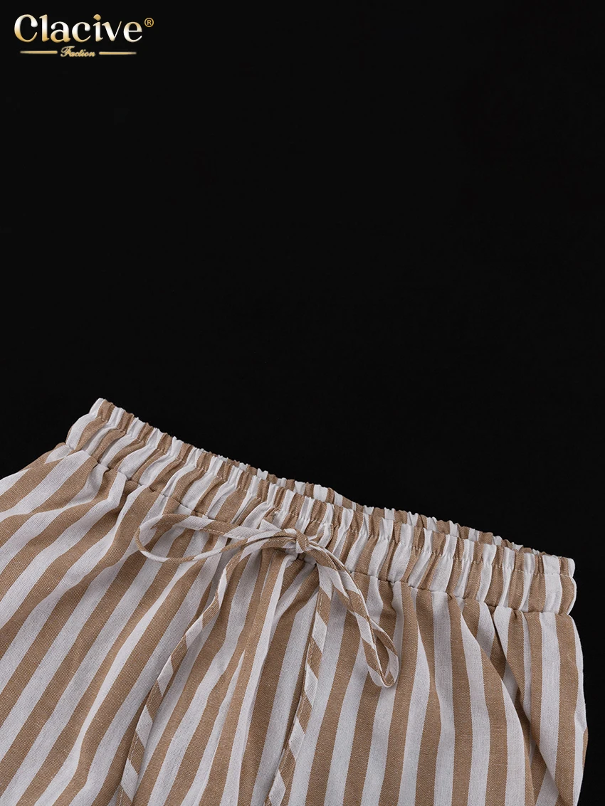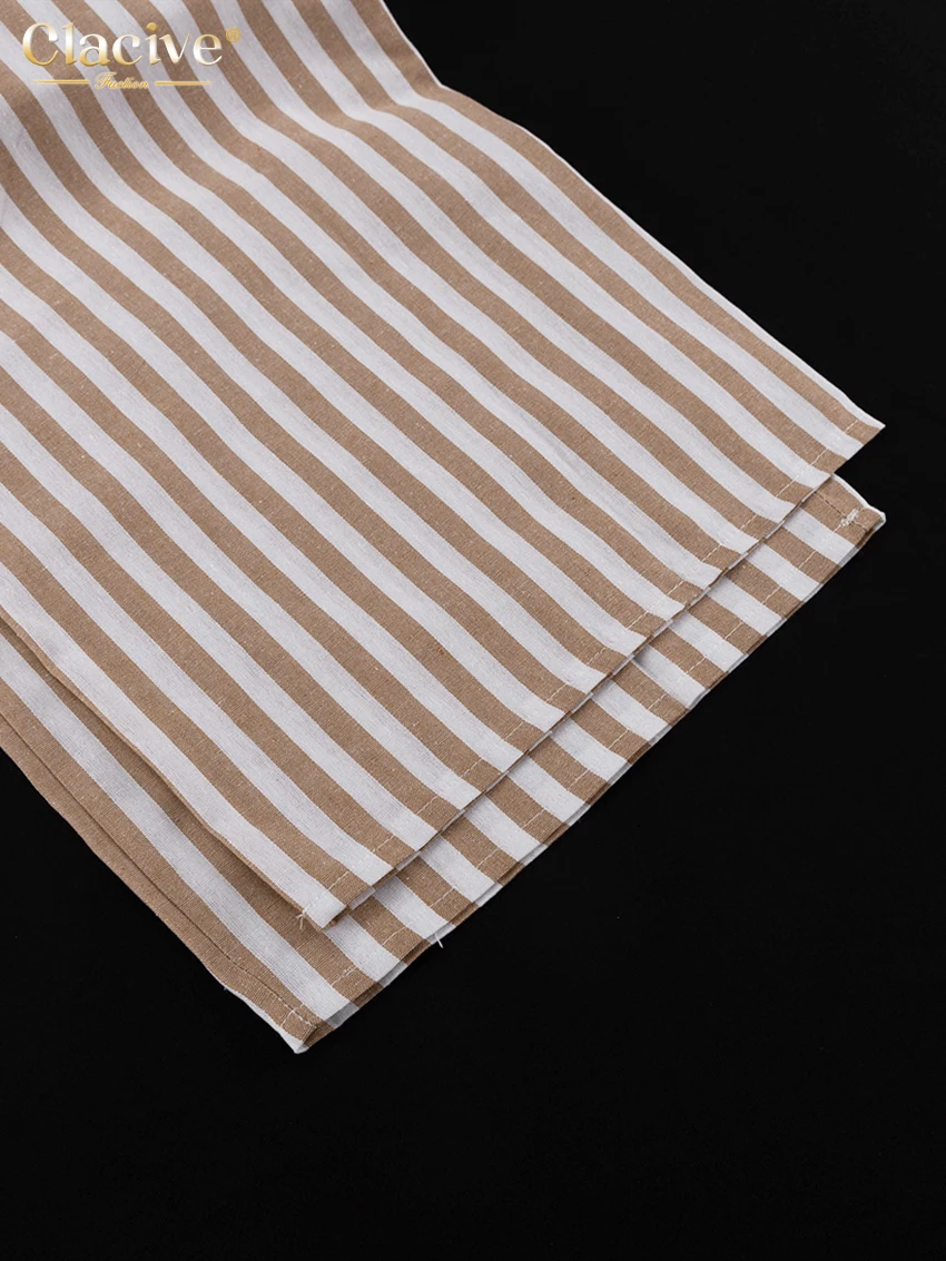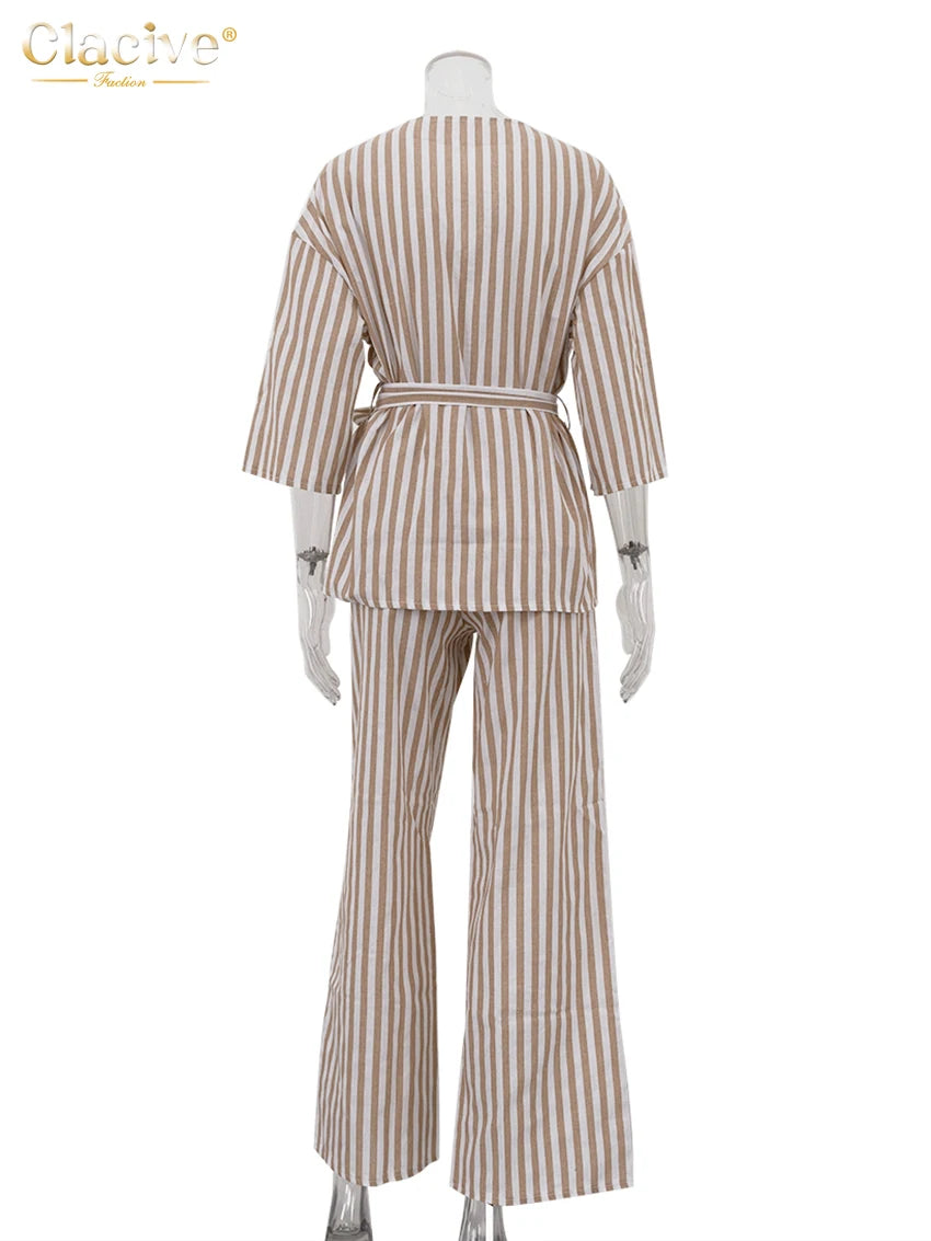 Clacive Fashion Loose Brown Stripe Trousers Set 2 Piece Woman Elegant Long Sleeve Shirt With High Waist Wide Pants Set Female