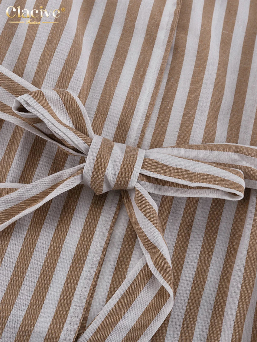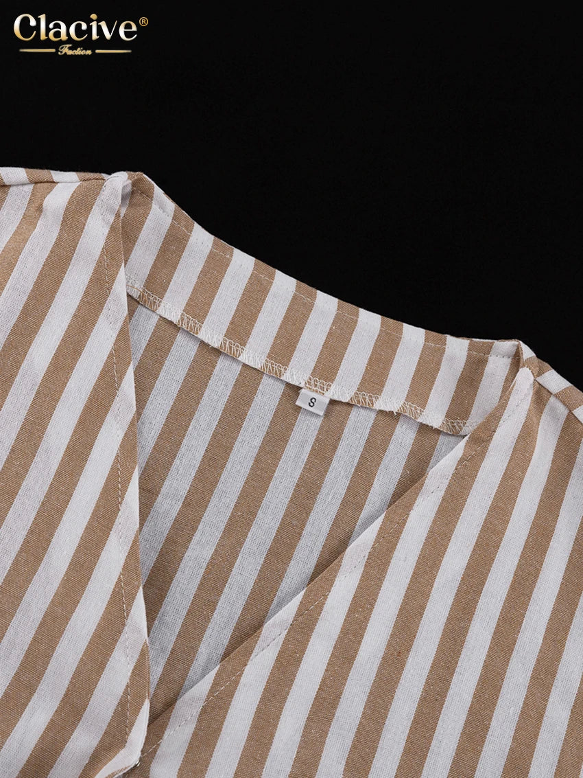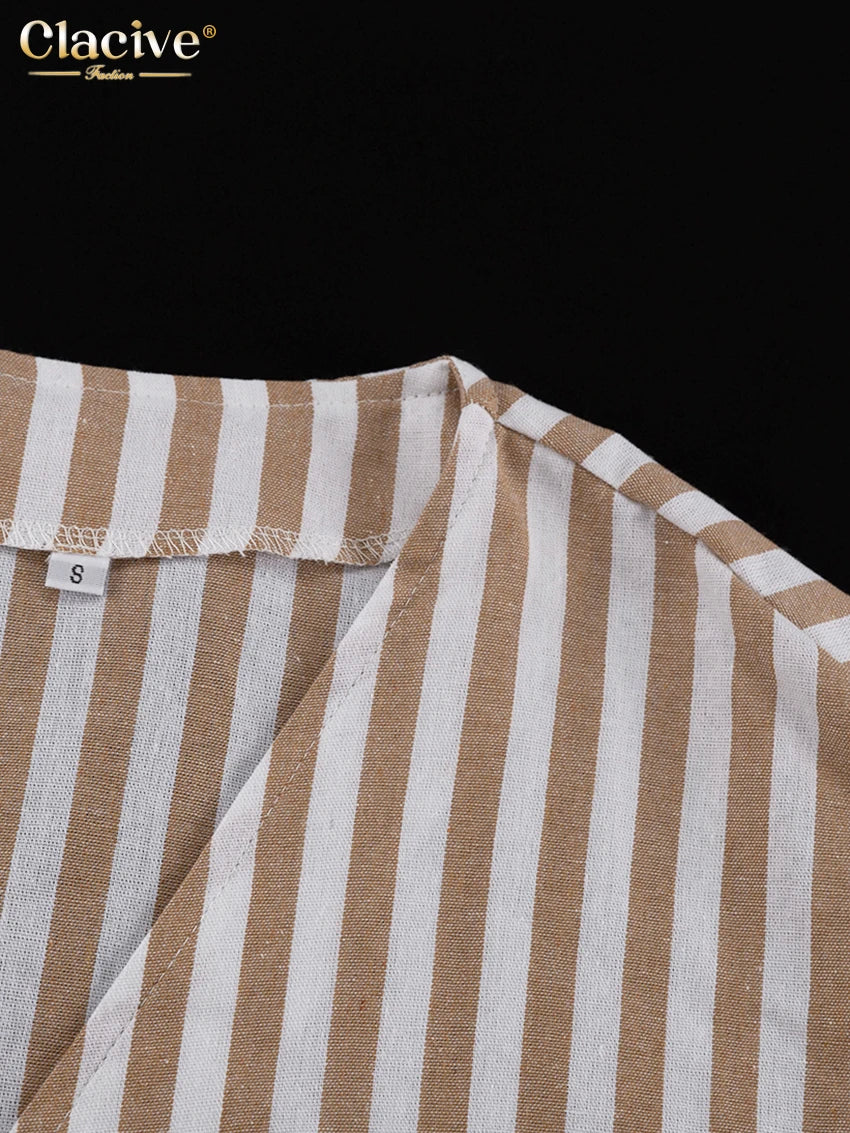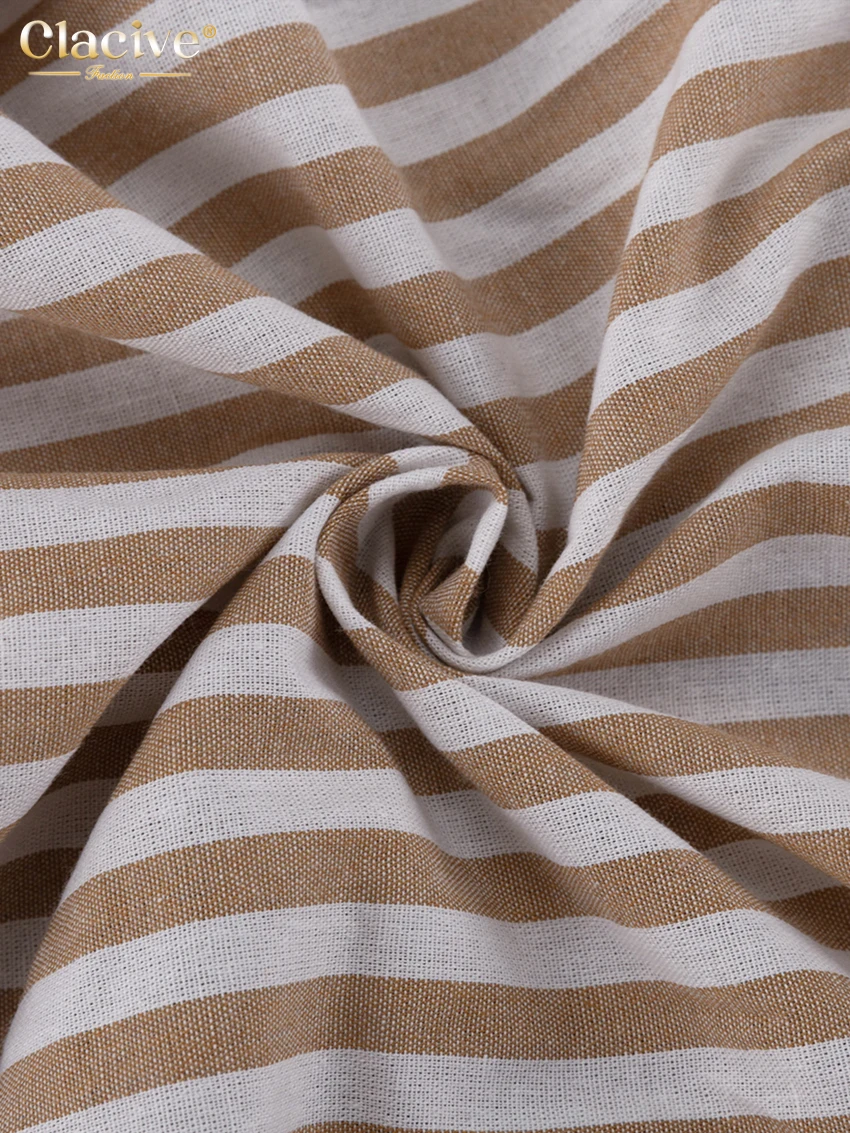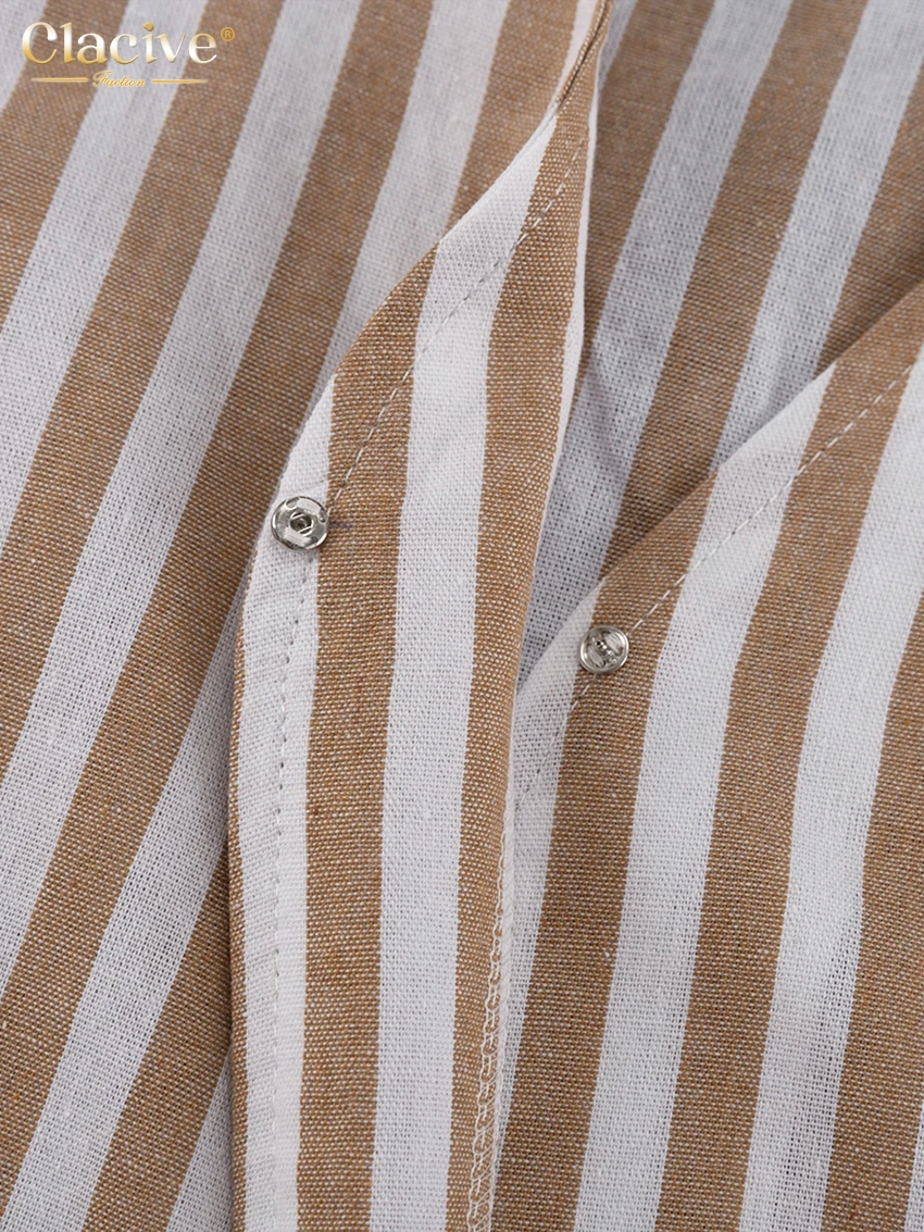 Clacive Fashion Loose Brown Stripe Trousers Set 2 Piece Woman Elegant Long Sleeve Shirt With High Waist Wide Pants Set Female